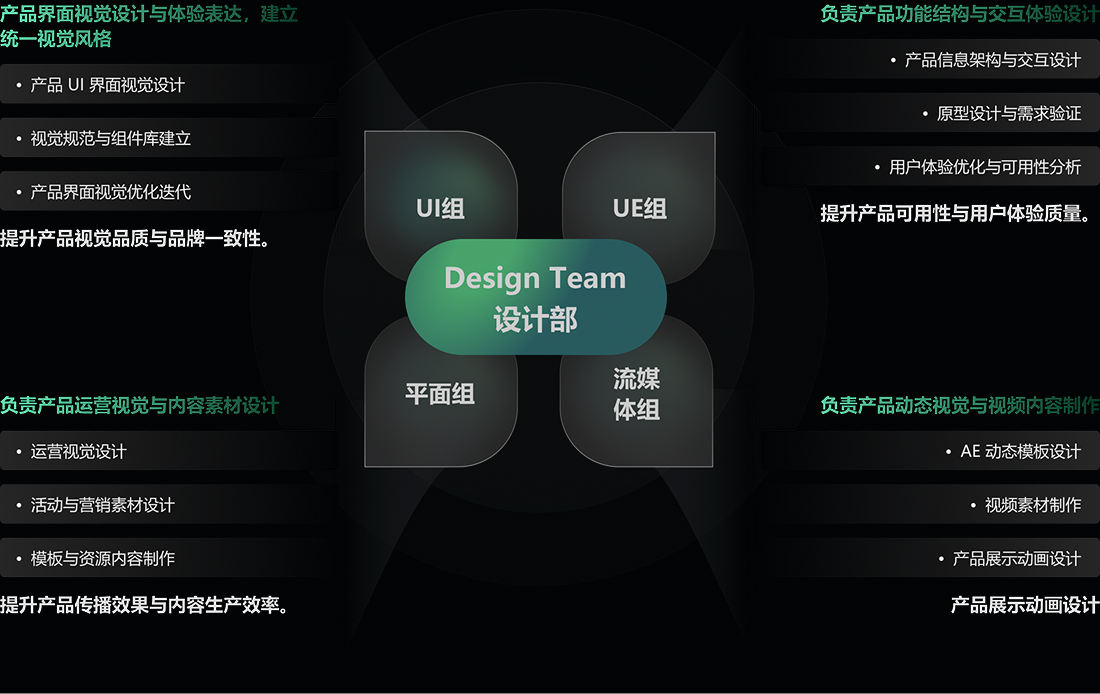 在团队建设过程中,我首先对现有设计资源进行能力评估,明确不同设计岗位的职责与发展方向,并通过持续招聘补充核心设计岗位,逐步完善团队结构。随着业务增长,设计团队规模从最初的 5人逐步扩展至 40人规模的设计团队,团队涵盖 UI设计、UE交互设计、平面设计、流媒体设计以及异地设计团队,形成完整的设计生产体系。